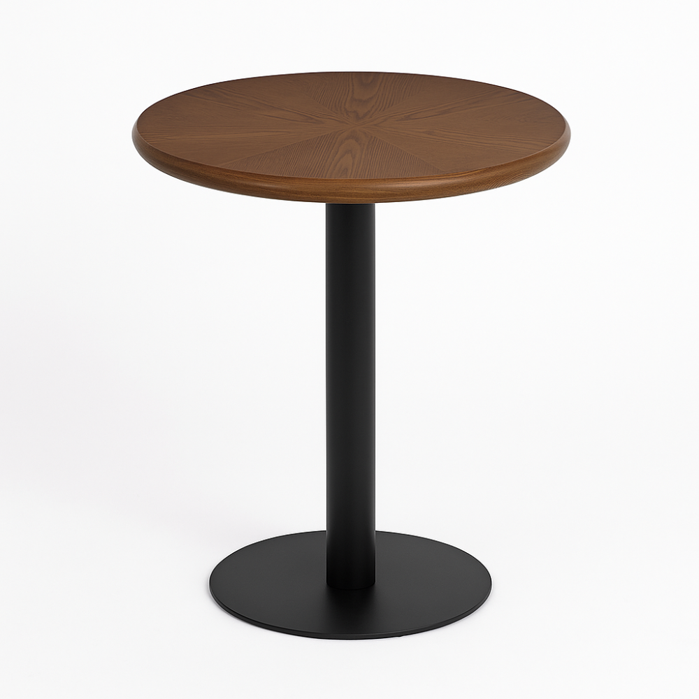 طاولة قهوة/كافيه دائرية بلون الجوز — قطر 60 × ارتفاع 75 سم، قاعدة حديد سوداء