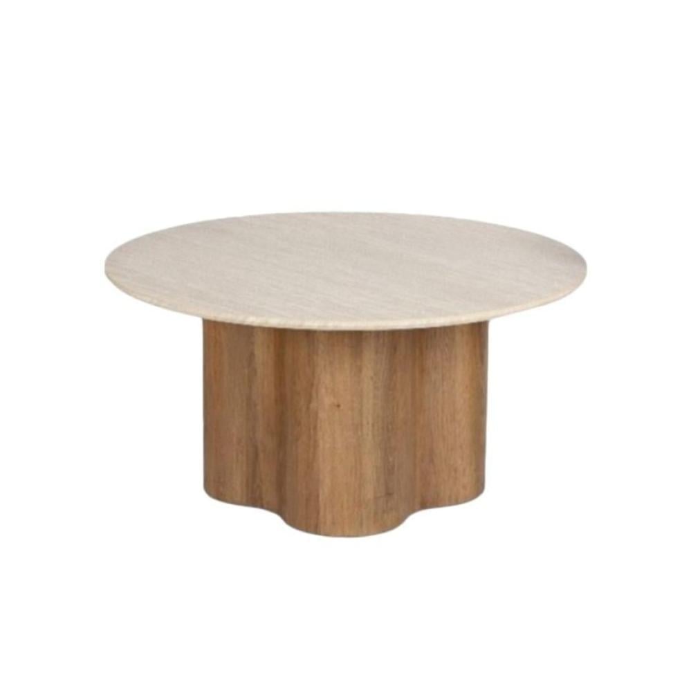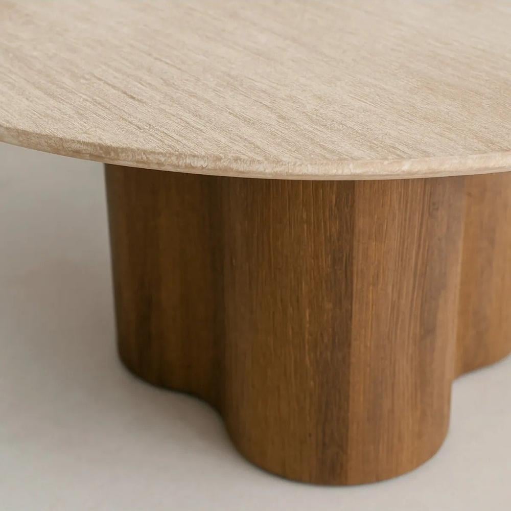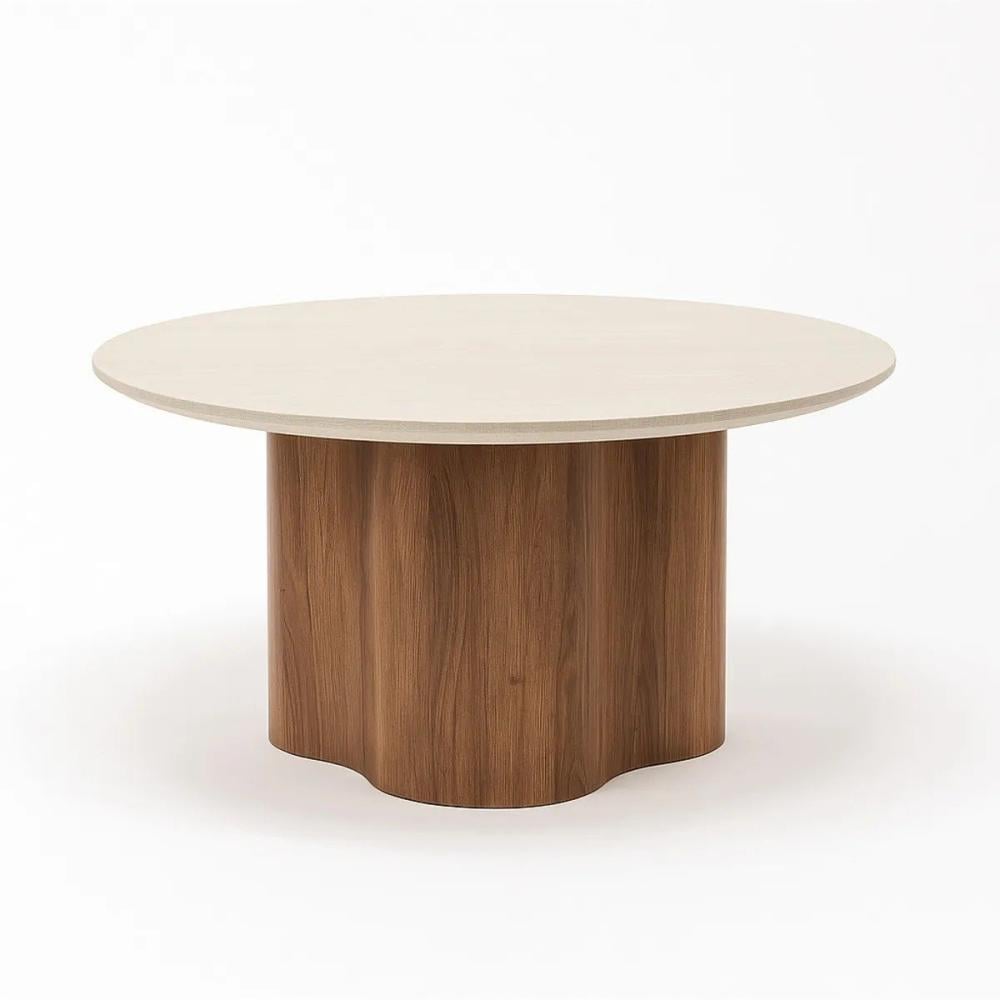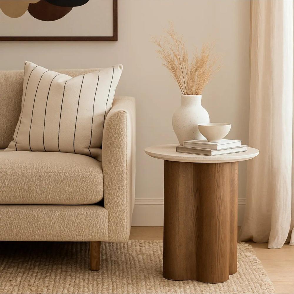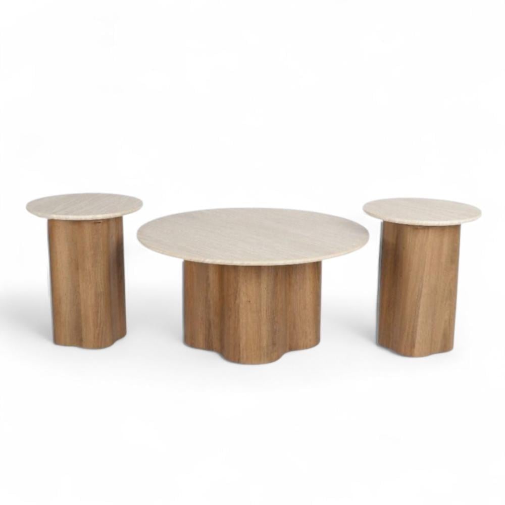 يجمع الطقم دفء الخشب مع بساطة عصرية ليكون نقطة التقاء أنيقة في غرفة المعيشة أو المجالس أو الاستقبال. القواعد الأسطوانية المموجة تمنح إحساسًا نحتيًا لطيفًا دون مبالغة، بينما تحافظ الأسطح البيج المطفية على خفة المشهد. نسّق القطع الثلاث معًا لإطلالة متدرجة، أو وزّع الطاولتين الجانبيتين بجوار الأريكة لتبقى الضيافة في المتناول.