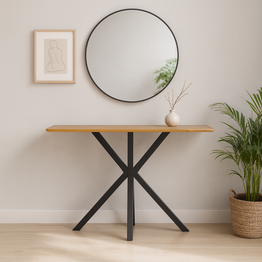 When guests step inside, this console sets the tone—calm, confident, and beautifully composed. Its rounded edges soften the silhouette, while the black steel base adds a precise architectural line that anchors the space. A vase, a tray for keys, a framed photo—suddenly the entry feels intentional rather than improvised.